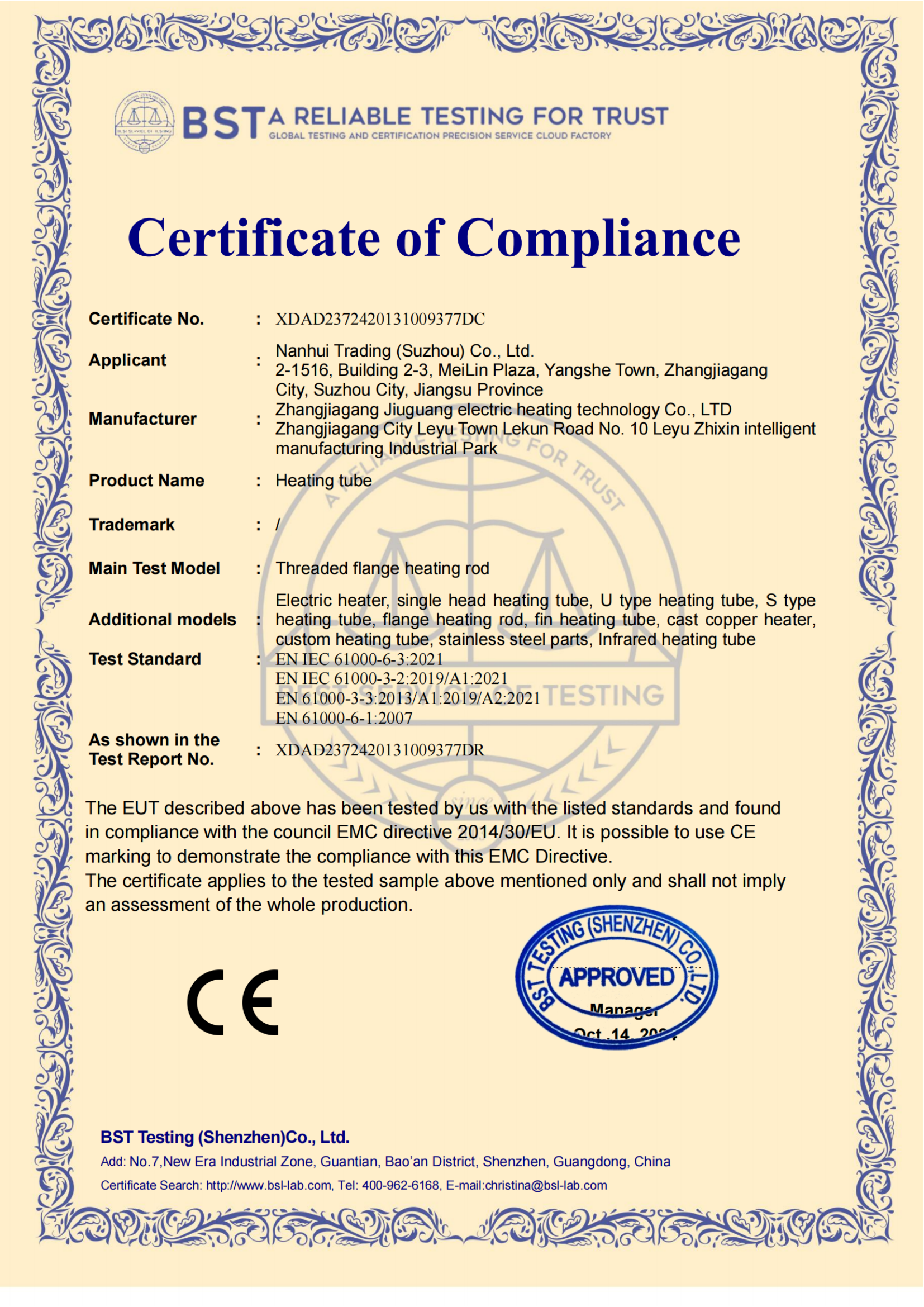 张家港市九光电热科技有限公司创建于2019年,专业生产各类电热电器产品,包括:电热元件、电热管(电加热管)、工业用电热电器、石英电热管(石英电热元件)、电热管散热片、钛制品等。本公司位于张家港市,是本市从事电热产品较早的一批企业之一,是集生产、加工和产品研发为一体的综合性企业。公司拥有现代化厂房约2600 平方米,拥有一支高效的管理和生产团队。
